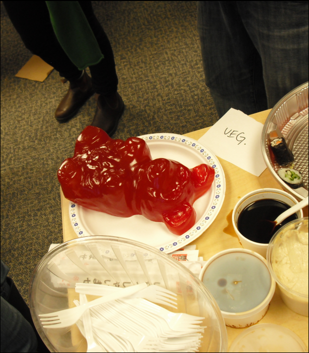 Refreshments included an inordinate number of varieties of cheese; and thanks to MA student Maddie Shellgren, we were all treated to the sight (and taste) of a twelve-inch-tall gummy-bear.